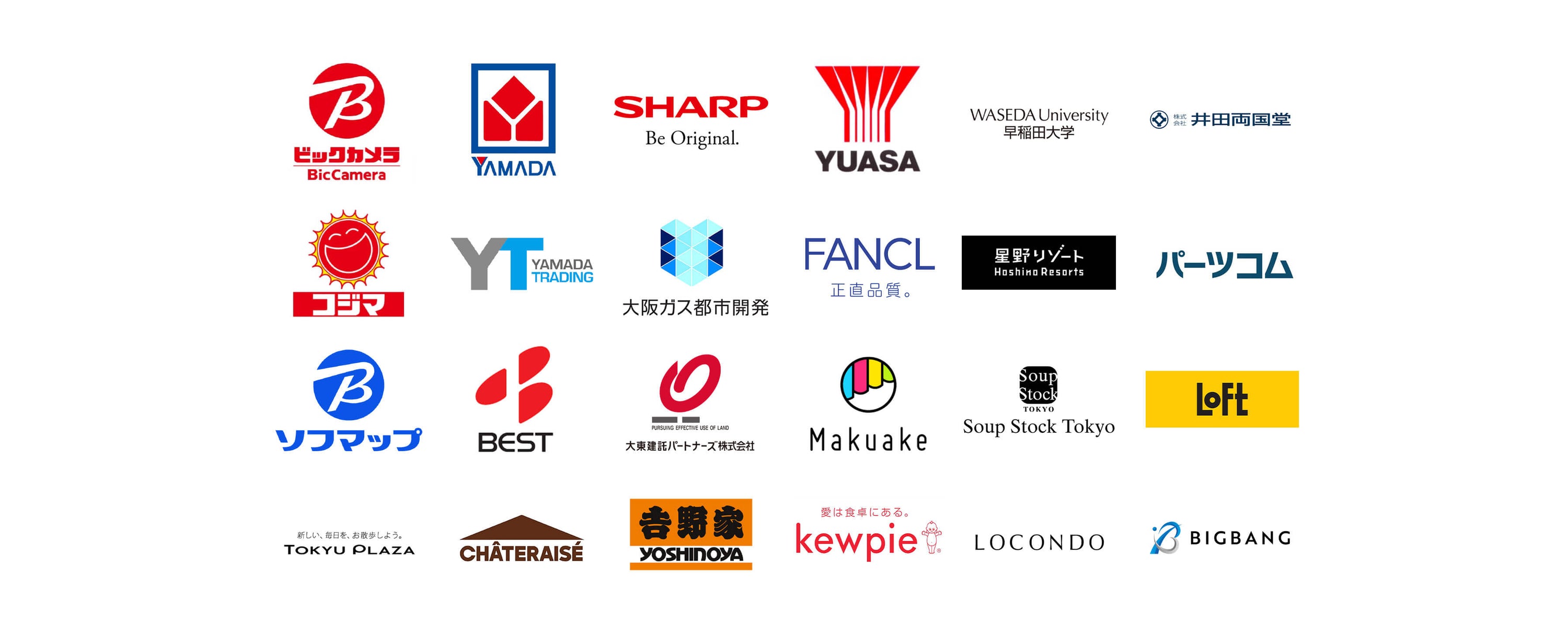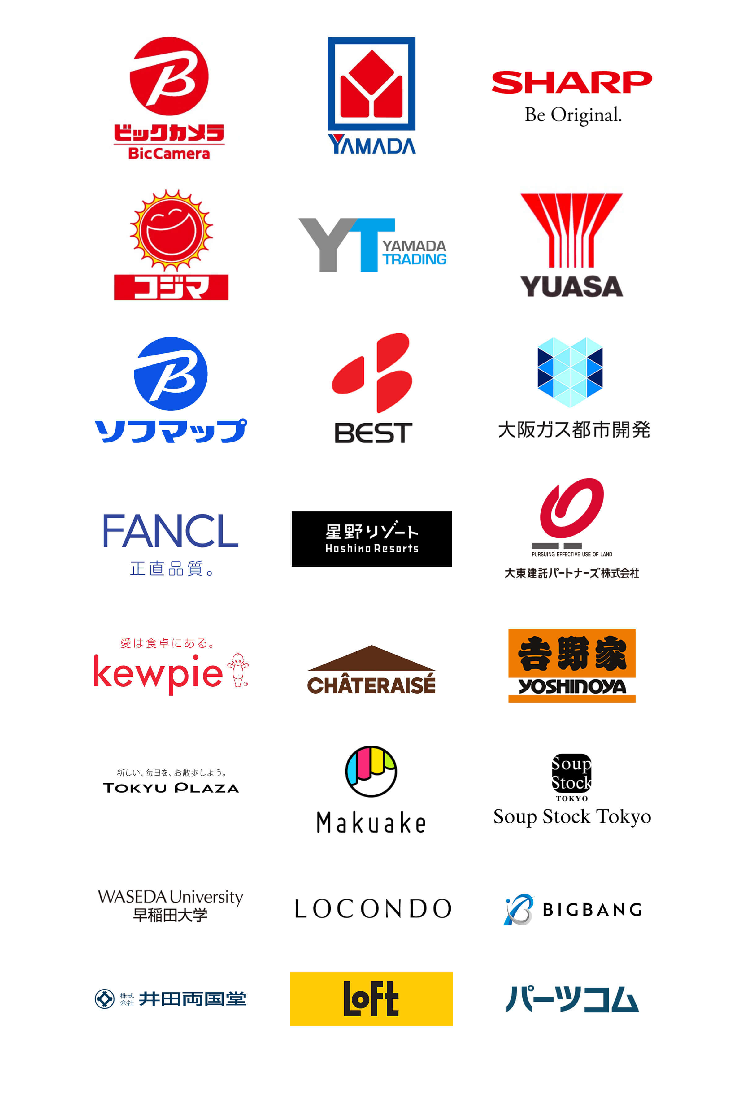 株式会社ビックカメラ / シャープマーケティングジャパン株式会社 / ユアサ商事株式会社 / 大阪ガス都市開発株式会社 / 株式会社ヤマダデンキ/ 大東建託パートナーズ株式会社 / 株式会社ファンケル / 東急プラザ / 株式会社マクアケ / 株式会社吉野家 / 株式会社シャトレーゼ / 株式会社星野リゾート / 株式会社スープストックトーキョー / キユーピー株式会社 / 早稲田大学 / ジェイドグループ株式会社 / 株式会社井田両国堂 / 株式会社ロフト / 他