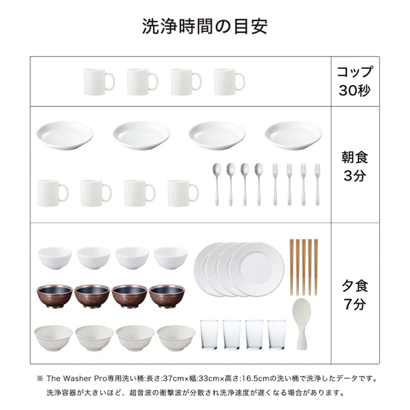 ※洗浄する際に食器類は水に完全に沈め、食器同士を窮屈に置かないでください。また、食器類、フライパンの蓋やワイングラスといった、ガラス製品に小さなヒビがある場合、万が一の破損を防ぐために本製品での洗浄をおやめください。