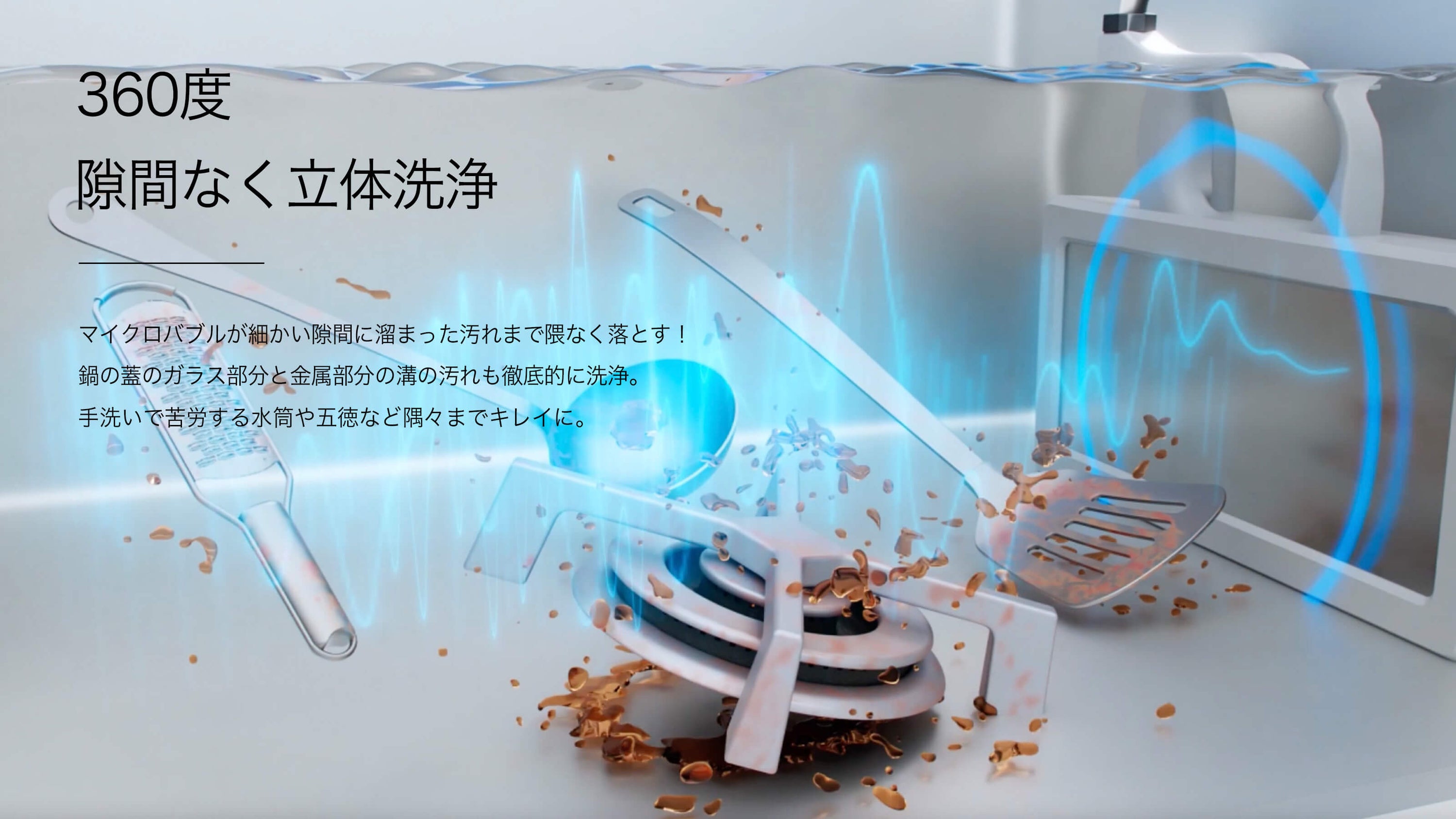 今までの超音波の洗浄原理は眼鏡や小物などに応用されてきましたされてきましたが、出力が低いため、素早く食器をきれいにするのは無理でした。「The Washer Pro」350Wでパワフル洗浄を実現しました。20倍の出力で作った数えきれないほどのマイクロバブルが一気に破裂する時の衝撃波で汚れを直接破壊します。