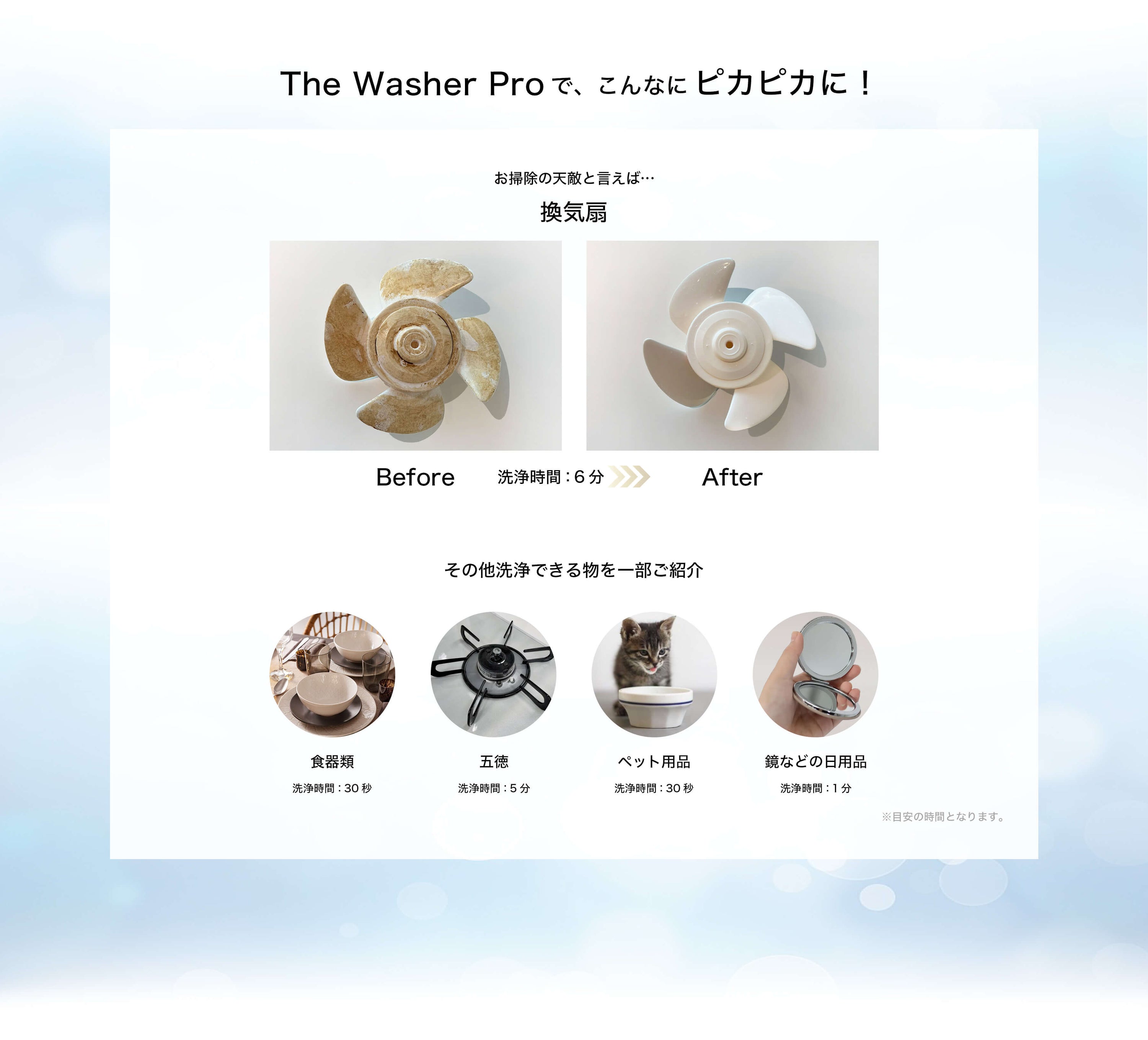「The Washer Pro」はシンクを使うので、形が複雑な食器から大きな換気扇の洗浄可能です。超音波の力で冷水でもガラス類を30秒で洗浄します。高温による食器の破裂や変形の心配はありません。また、おもちゃや、キャンプ道具の洗浄、ペット用品の洗浄など幅広く洗浄可能です。